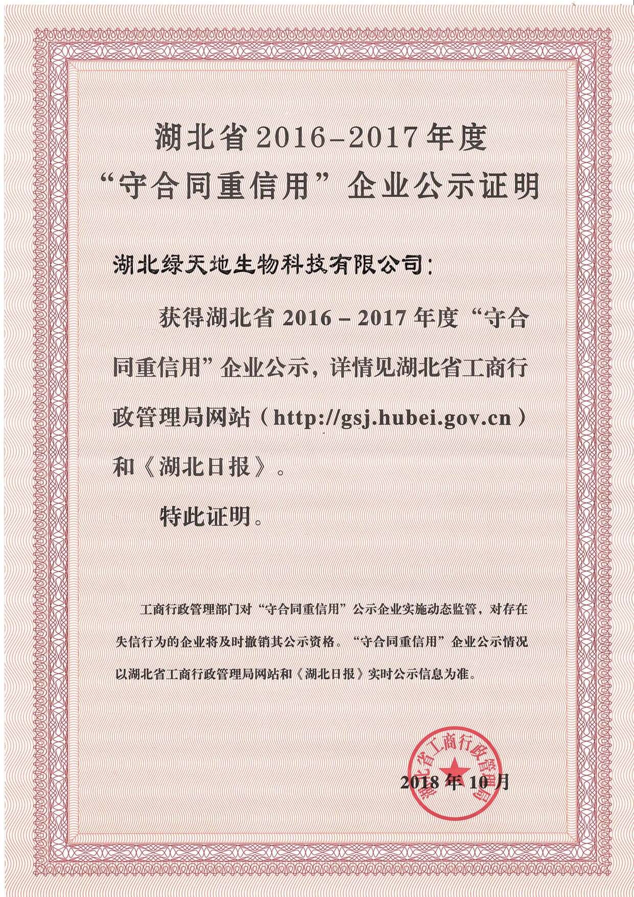 公司獲得湖北省2016-2017年度“守合同重信用”企業(yè)公示