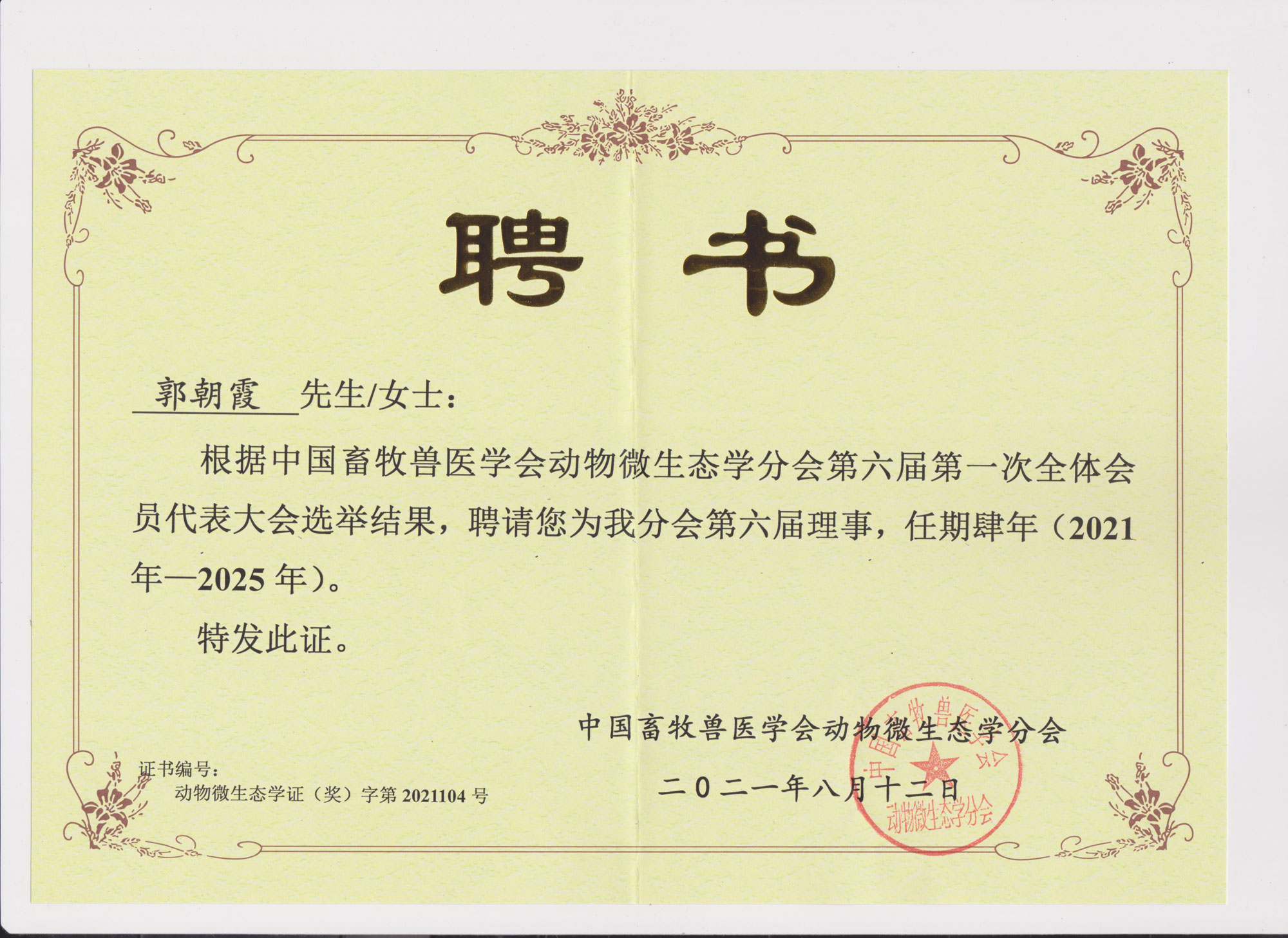 總經(jīng)理郭朝霞女士被聘為中國畜牧獸醫(yī)學會動物微生態(tài)學分會第六屆理事