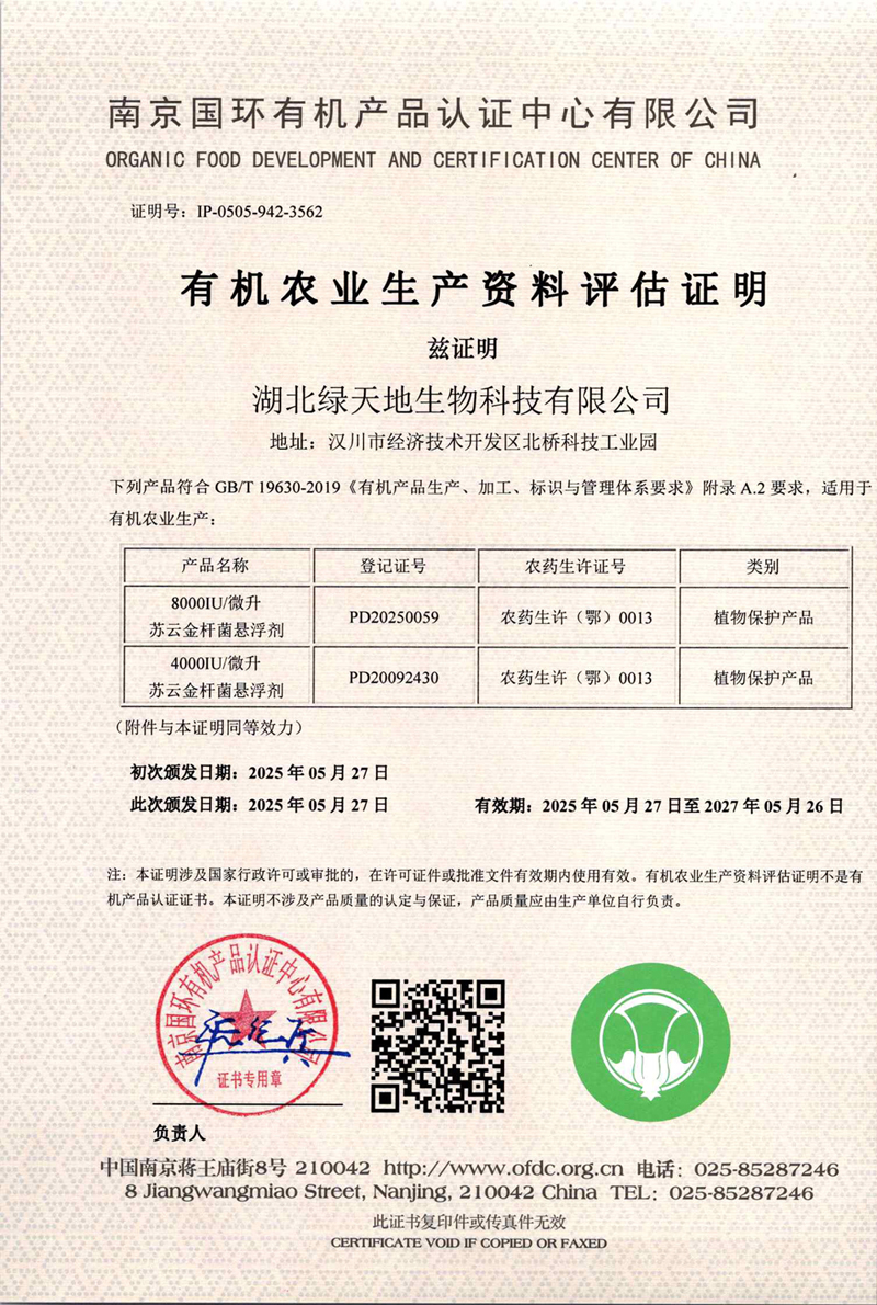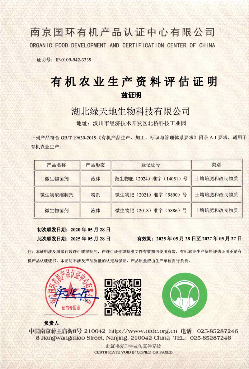 公司5款產(chǎn)品獲得有機農(nóng)業(yè)生產(chǎn)資料評估證明
